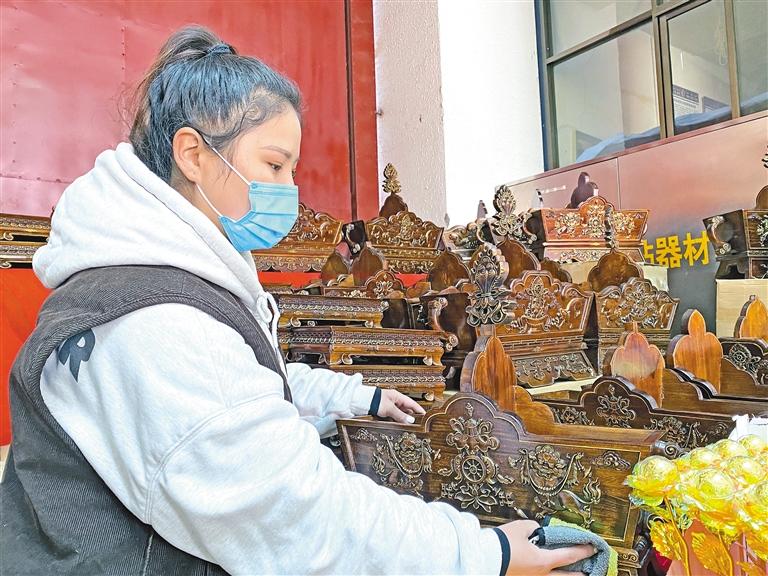 來自山南市貢嘎縣的拉吉帶著自家生產(chǎn)的“切瑪盒”第2次來到八廓商城年貨市場?!坝捎谑亲约疑a(chǎn),所以我們自主設計了一款線條稍微簡約的‘切瑪盒’;還有一款傳統(tǒng)線條與圖案的‘切瑪盒’。在顏色上,我們選擇了較為持重的深色,這樣的顏色大氣沉穩(wěn),許多市民非常喜歡,兩款售價都是380元?!崩榻B道。