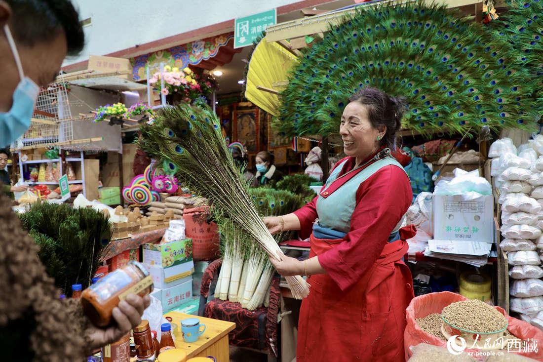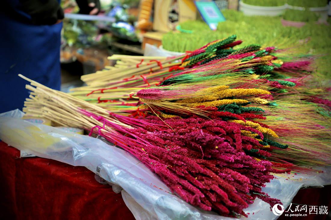 八廓商城一角售賣的 “羅薩美朵”。(每年的藏歷新年,家家戶戶的切瑪盒里都要插上 “羅薩美朵”,代表著溫馨的家庭里有著幸福的祝愿,承載著歡樂(lè)的故土上,能夠五谷豐登的期盼。)人民網(wǎng) 次仁羅布攝