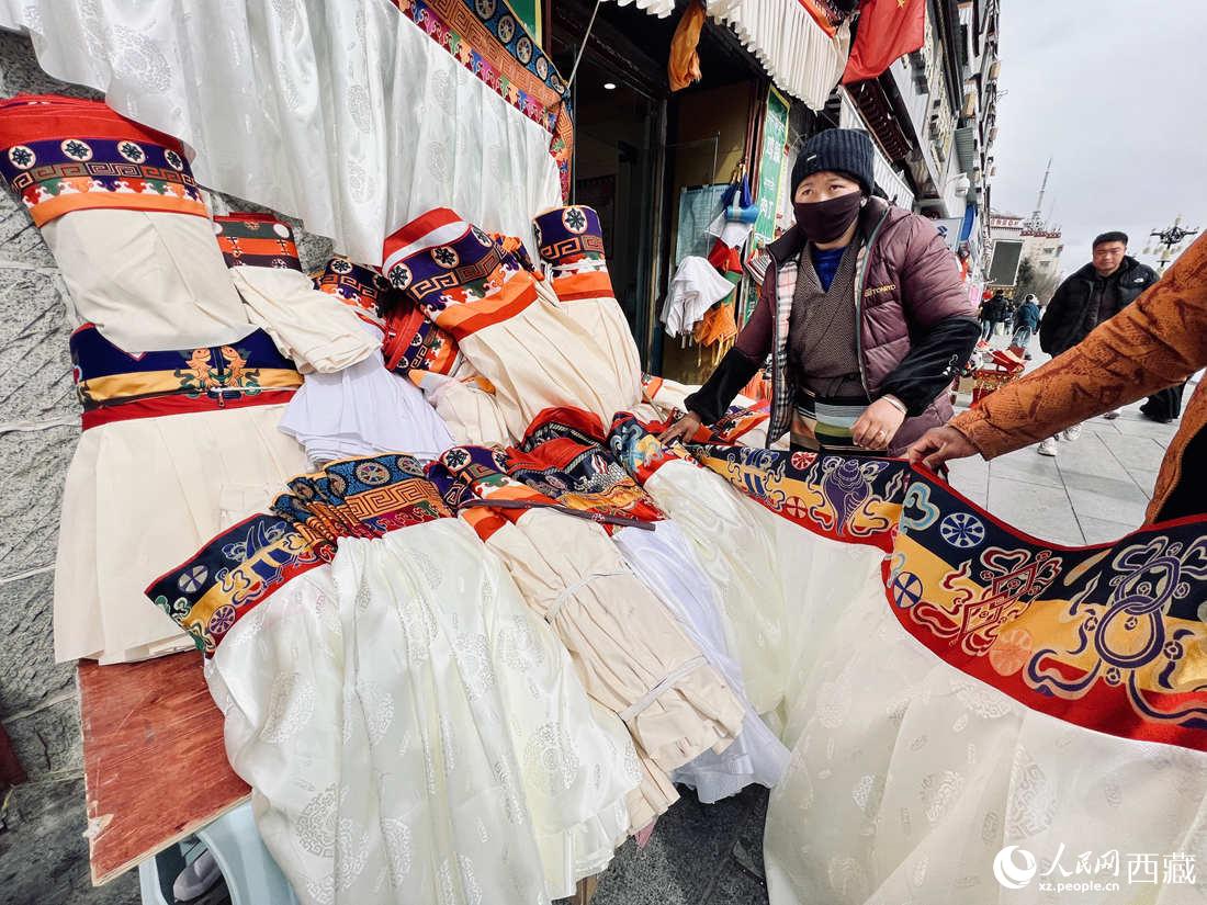 賣家按照要求為客戶裁量“香布”長(zhǎng)度。(藏式建筑的一種特殊裝飾,懸掛在門窗上部,通?!跋悴肌睘橐荒暌粨Q,祈求新的一年吉祥如意。)人民網(wǎng) 次仁羅布攝