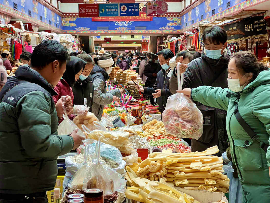 沖賽康市場(chǎng)、八廓商城、拉薩市區(qū)各大小超市熱鬧非凡、人頭攢動(dòng),處處都是為了采購(gòu)藏歷新年年貨樂(lè)此不疲的居民群眾,耳邊盡是熟悉的吆喝聲,到處都是歡樂(lè)與喜慶。