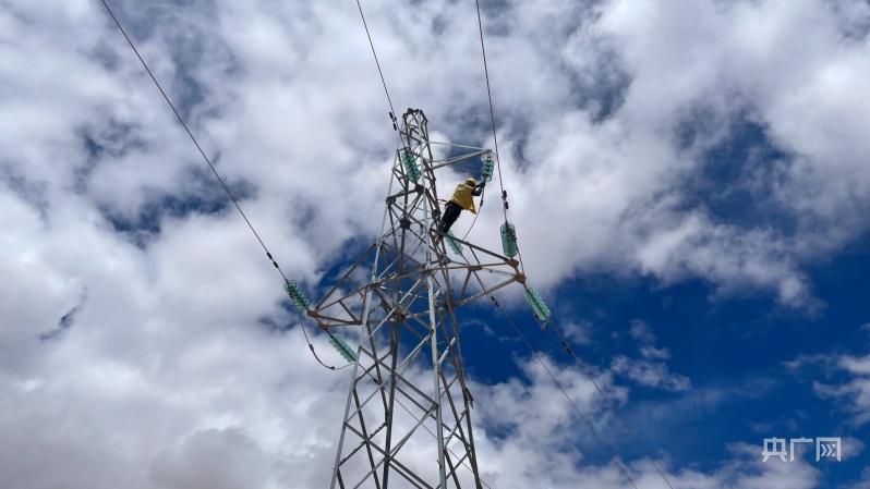電力線路工在18米鐵塔檢修懸式絕緣設(shè)備(央廣網(wǎng)發(fā) 周賀 攝)