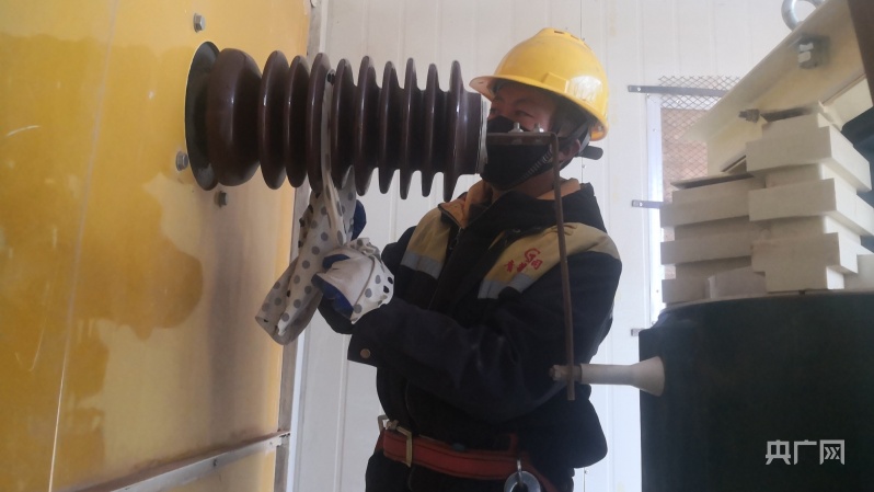 電力線路工在清洗絕緣設(shè)備(央廣網(wǎng)發(fā) 周賀 攝)