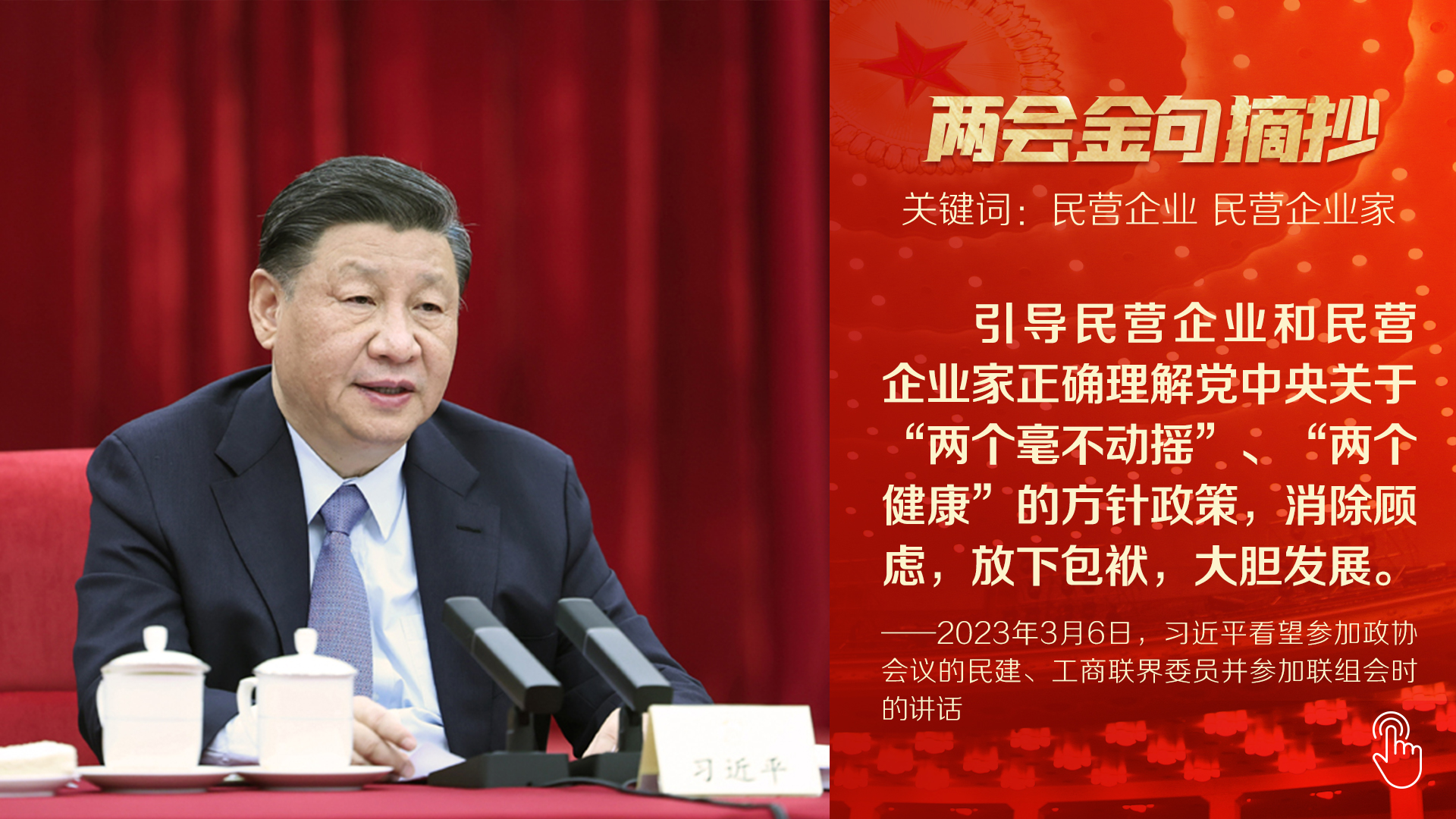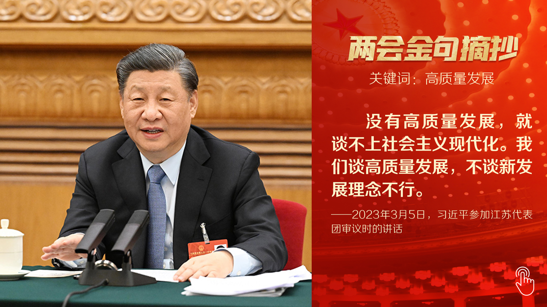 “高質量發(fā)展是全面建設社會主義現(xiàn)代化國家的首要任務?!苯衲陜蓵状蔚綀F組,總書記以高質量發(fā)展為題,詳細闡述中國未來施政發(fā)力點。第二天參加民建、工商聯(lián)界委員聯(lián)組會,他又就正確引導民營經濟健康發(fā)展、高質量發(fā)展作出重要論述,一句“要堅守主業(yè)、做強實業(yè),自覺走高質量發(fā)展路子”為全國4700多萬家民營企業(yè)指明方向。十四屆全國人大一次會議閉幕會上,總書記再次向世界宣示:在強國建設、民族復興的新征程,我們要堅定不移推動高質量發(fā)展。