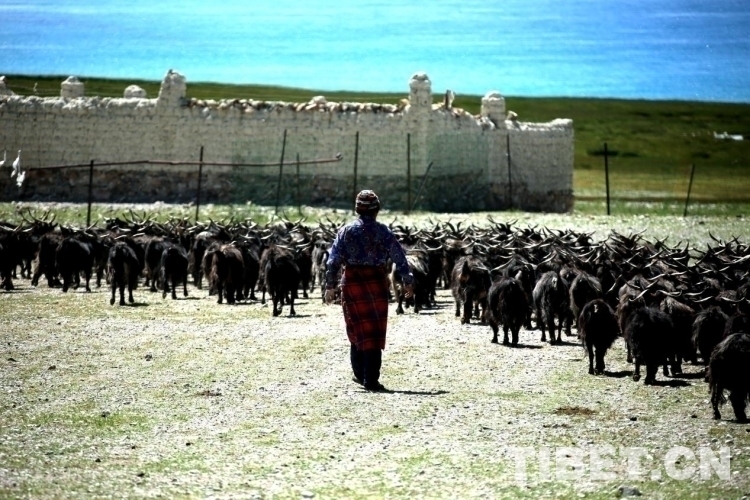資料圖:阿里地區(qū)措勤縣牧民驅(qū)趕著紫絨山羊群前往扎日南木錯(cuò)湖邊
