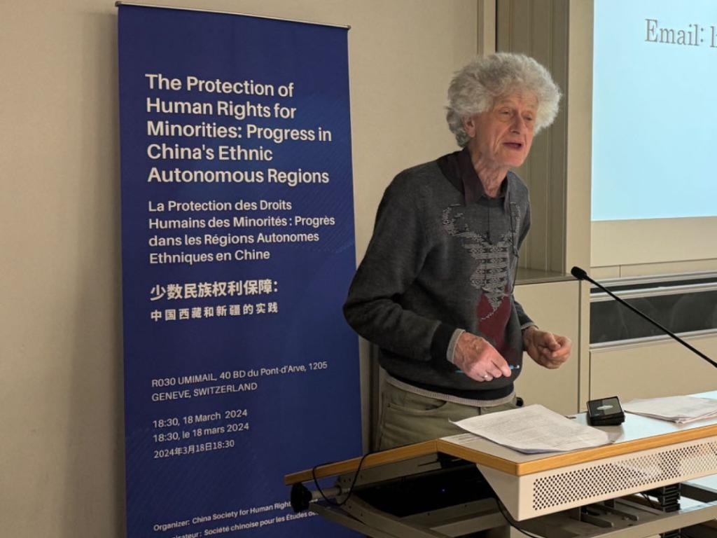 3月18日,由中國人權(quán)研究會主辦的“少數(shù)民族權(quán)利保障:中國西藏和新疆實踐”主題講座在瑞士日內(nèi)瓦舉行。圖為比利時知名藏學家安德烈·拉克魯瓦在講座上發(fā)言。新華社記者石松攝