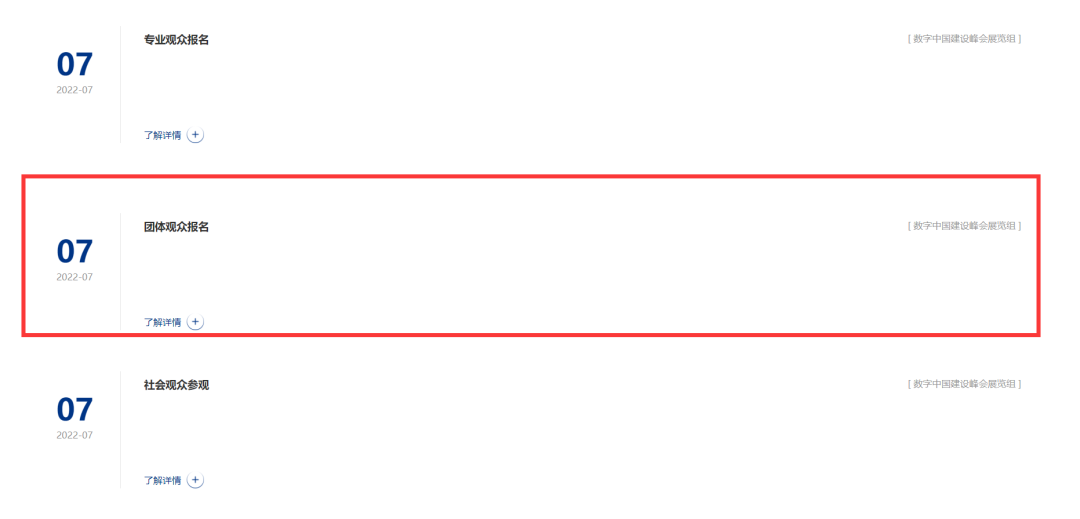 進(jìn)入數(shù)字中國(guó)建設(shè)峰會(huì)官網(wǎng),點(diǎn)擊“觀眾報(bào)名”欄目,選擇“團(tuán)體觀眾報(bào)名”。