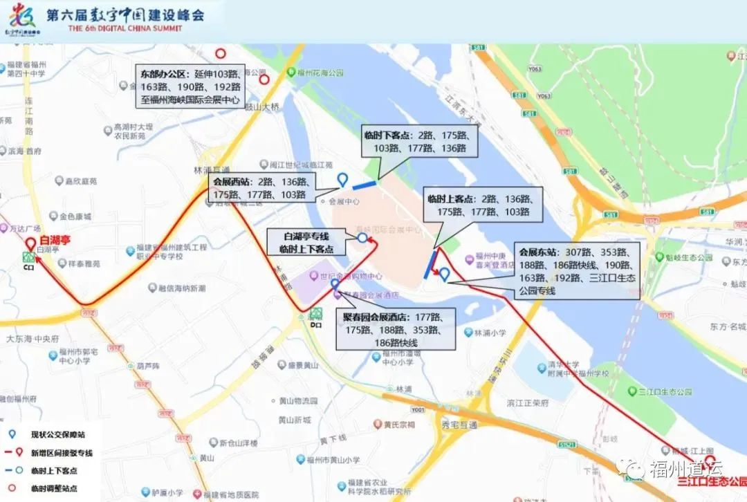 (2)可乘坐三江口生態(tài)公園——公交海峽國(guó)際會(huì)展中心東站區(qū)間專線,從三江口生態(tài)公園出發(fā)沿著南江濱東大道、浦下洲路、會(huì)展東路至公交海峽國(guó)際會(huì)展中心東站。