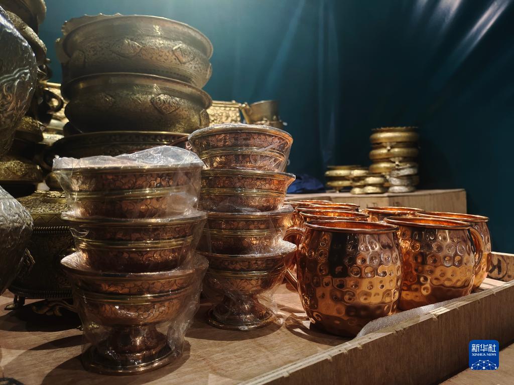 這是藏博會上的尼泊爾銅器展示點位。新華社記者 劉洲鵬 攝
