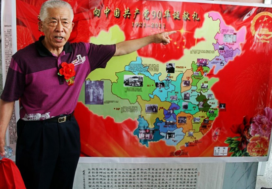 毛澤東圖片收藏者梁國(guó)忠講述自制的開(kāi)國(guó)領(lǐng)袖毛澤東主席《祖國(guó)大地處處有您的足跡》的中國(guó)地圖。