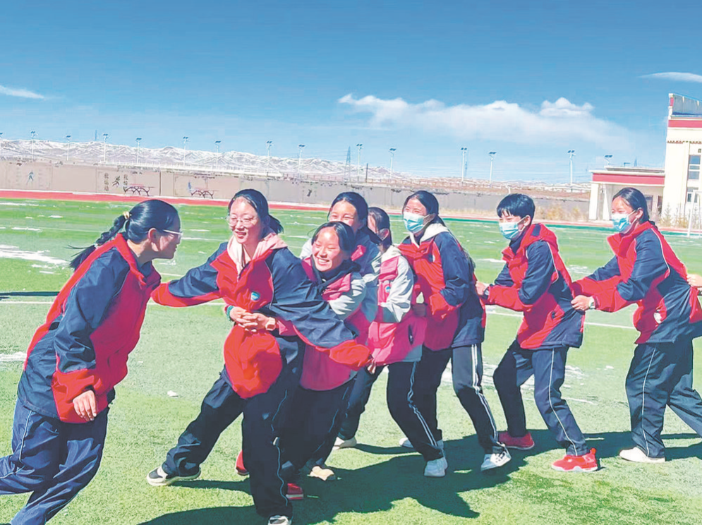 “中石化女子春蕾班”的孩子們在操場上愉快玩耍。
