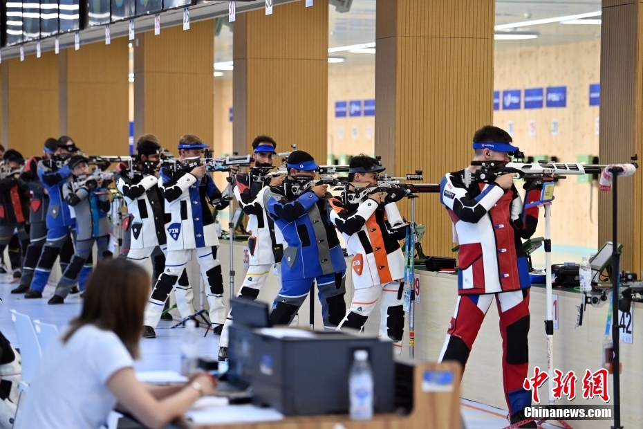 7月31日,第31屆世界大學(xué)生夏季運(yùn)動會男子10米氣步槍團(tuán)體決賽在成都市射擊運(yùn)動學(xué)校舉行,印度隊(duì)、中國隊(duì)、哈薩克斯坦隊(duì)分獲冠亞季軍。圖為男子10米氣步槍團(tuán)體決賽比賽現(xiàn)場。中新社記者 九美旦增 攝