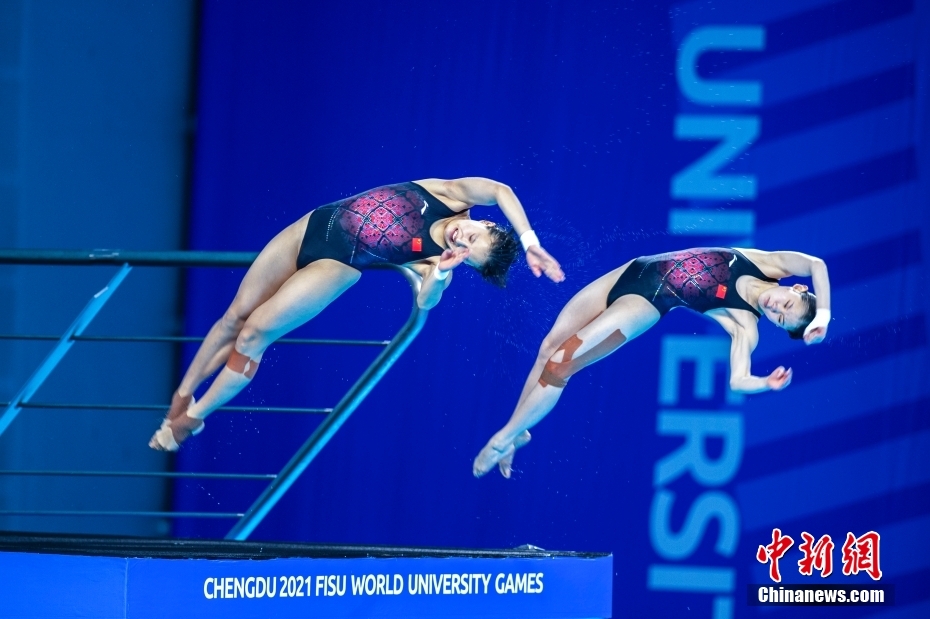 7月31日,在成都簡陽市文體中心游泳館舉行的第31屆世界大學生夏季運動會跳水女子雙人10米跳臺決賽中,中國組合張家齊/掌敏潔以349.08分的成績獲冠軍。圖為張家齊(右)/掌敏潔在比賽中。中新社記者 劉忠俊 攝