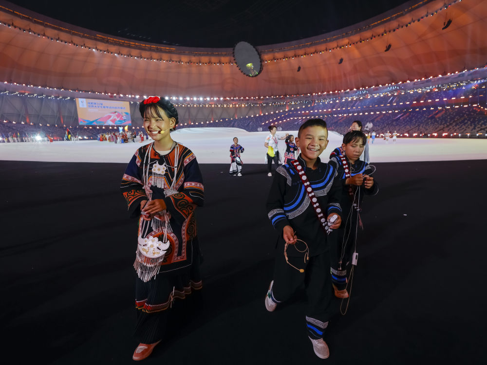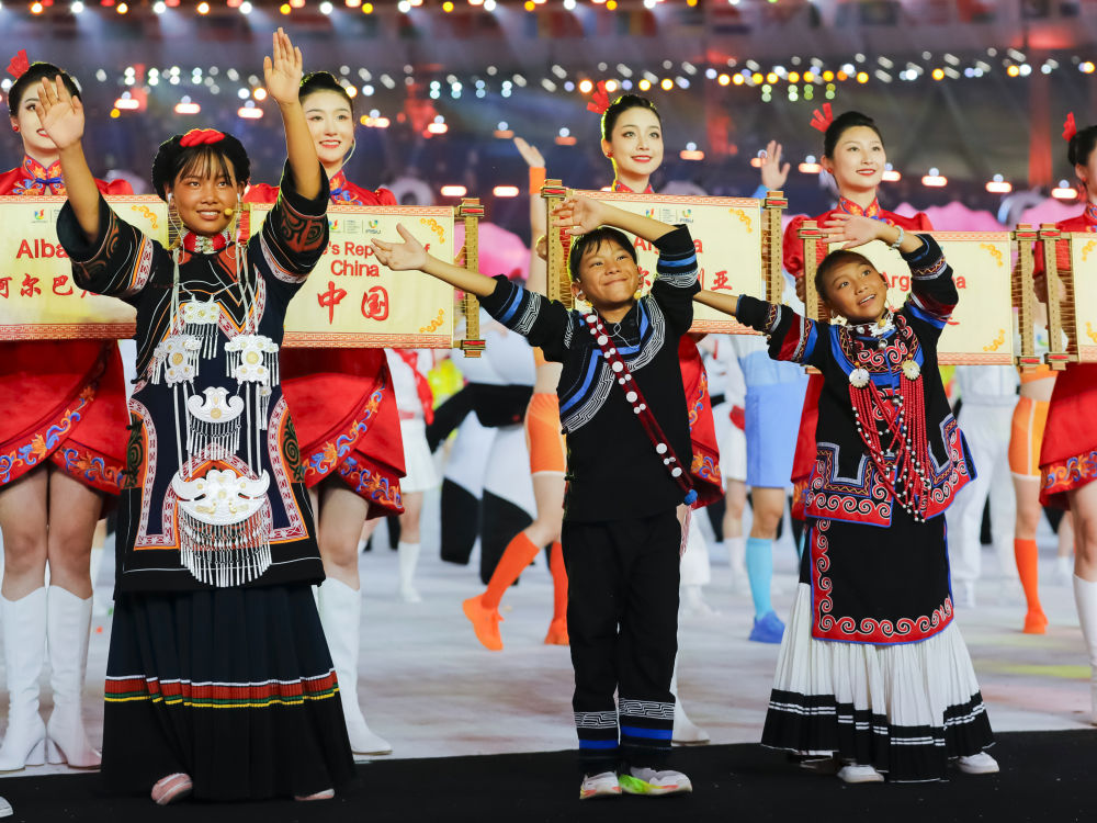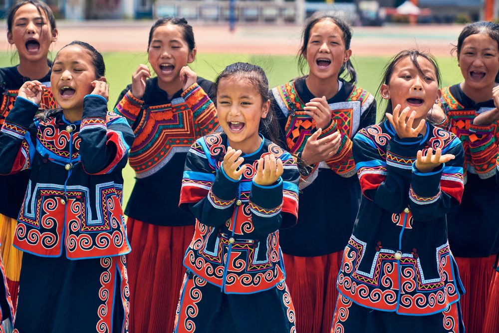 7月28日,來自四川涼山彝族自治州的孩子們在成都大運會開幕式上歌唱。新華社記者 陳澤國 攝