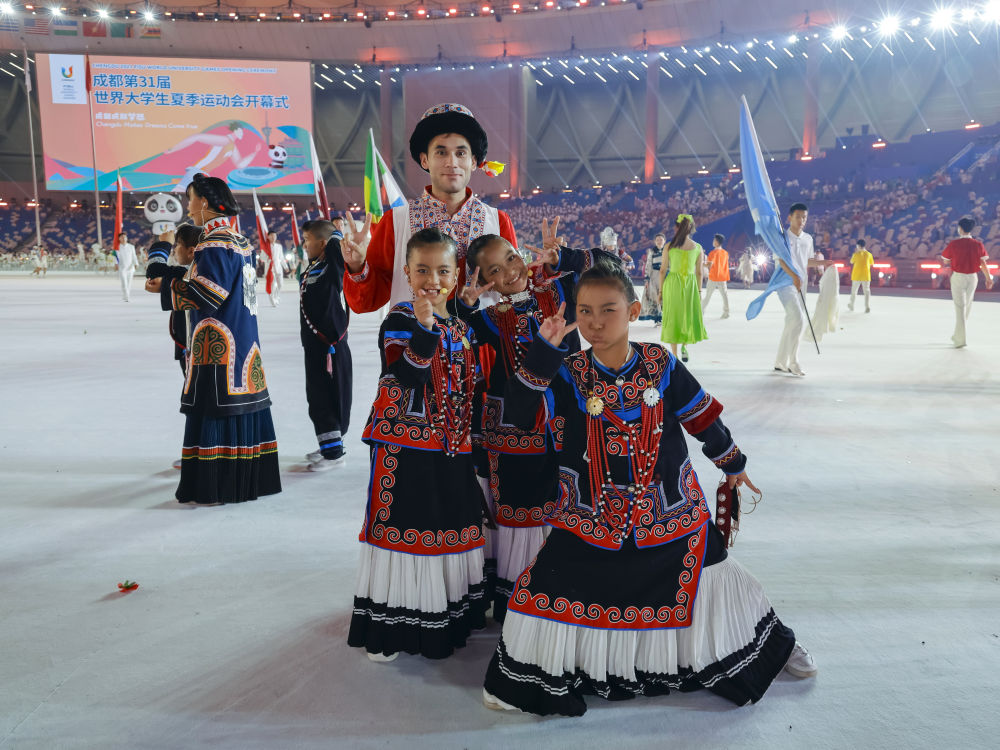 7月23日,在成都大運會開幕式彩排結(jié)束后,俄地惹漢、馬杰英和吉和拉作(前左至右)與來自新疆的塔吉克族演員拍攝合影。新華社記者沈伯韓 攝
