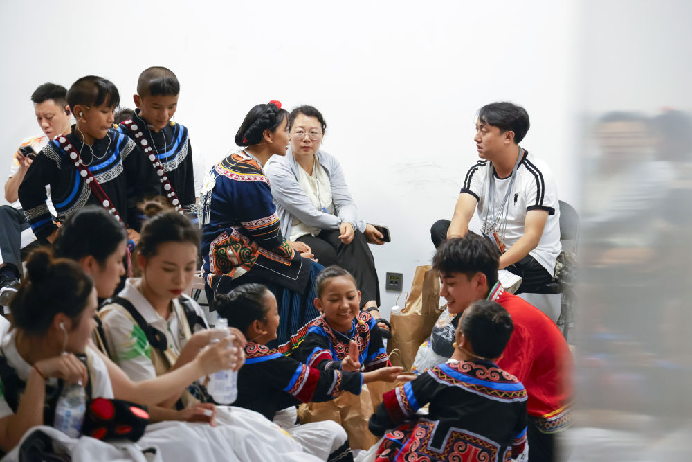 7月23日,在成都大運會開幕式彩排開始前,來自涼山州的孩子們在和他們的老師聊天。新華社記者沈伯韓 攝