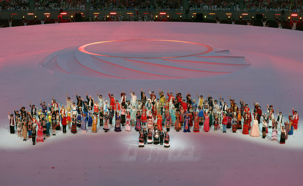 7月28日,吉好有果(中)在成都大運會開幕式上歌唱。新華社記者 陳澤國 攝