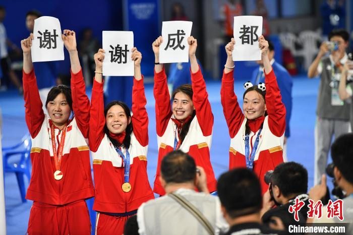 當(dāng)四位中國女將高高舉起“謝謝成都”四個大字,成都東安湖體育公園游泳跳水館沸騰了。7日晚,中國大學(xué)生游泳隊運動員柳雅欣、朱蕾桔、張雨霏和李冰潔在頒獎儀式后拿出了這份特別的禮物:感謝觀眾的陪伴與支持,也感謝成都的熱情與包容。