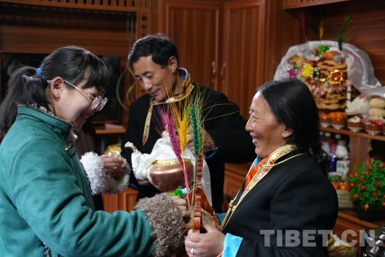 天亮以后,扎西江村一家人穿上新衣服,輪流敬切瑪、喝青稞酒,互道“扎西德勒”。扎西江村家的小女兒達娃倉決吃切瑪?shù)臅r候,先用拇指和食指抓起一小撮糌粑灑向空中3次,表示敬天地,然后把糌粑放進自己嘴里。喝青稞酒也同樣如此,要先用雙手接過酒杯,然后左手拿杯,右手無名指輕輕地在杯中蘸酒,彈向空中,如此反復(fù)三次。