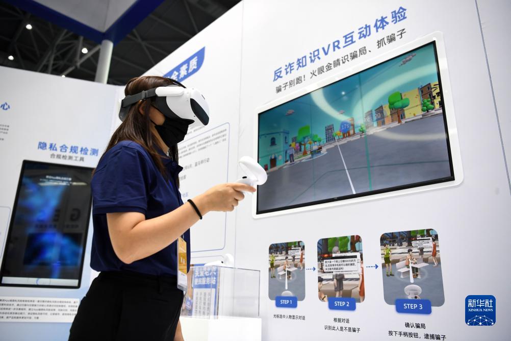 一家參展企業(yè)代表在2022年國(guó)家網(wǎng)絡(luò)安全宣傳周網(wǎng)絡(luò)安全博覽會(huì)上演示反詐知識(shí)VR互動(dòng)體驗(yàn)項(xiàng)目(2022年9月4日攝)。新華社記者 劉軍喜 攝