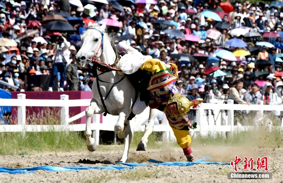 8月17日,騎手們進行馬術表演。當日,2023年拉薩雪頓節(jié)民族傳統(tǒng)馬術表演在西藏拉薩市北郊賽馬場舉行。