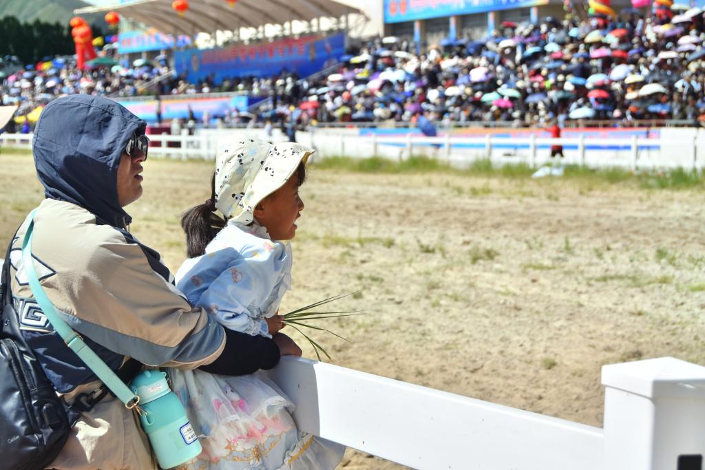 8月17日,2023拉薩雪頓節(jié)賽馬大會現場,一位父親帶著女兒來看比賽。新華社記者 劉文博 攝