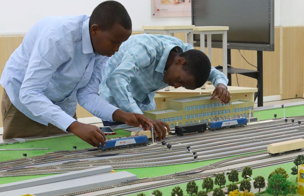 2022年9月19日,在位于吉布提首都吉布提市的工商學(xué)校,學(xué)生在魯班工坊鐵道運(yùn)營(yíng)沙盤教學(xué)區(qū)學(xué)習(xí)。