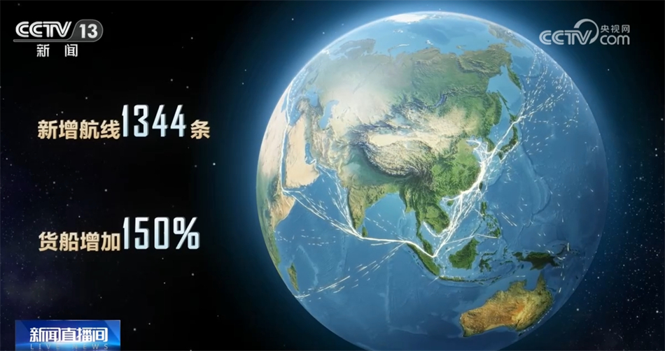 向大海,這是2013年時(shí)中國與共建“一帶一路”國家間的水運(yùn)航線。十年間,共建“一帶一路”國家間的水運(yùn)航線數(shù)量翻了一番,新增航線達(dá)到了1344條,穿梭其中的貨船增加150%?!敖z路海運(yùn)”航線已通達(dá)全球43個(gè)國家的117個(gè)港口,織出了一張聯(lián)通世界的貿(mào)易流動(dòng)網(wǎng)絡(luò)。