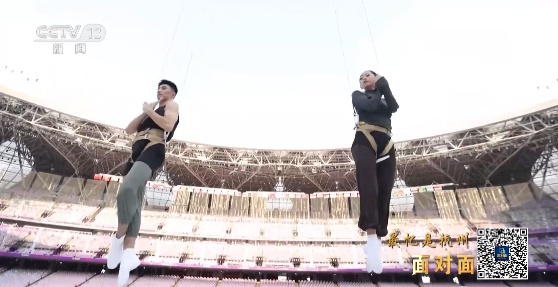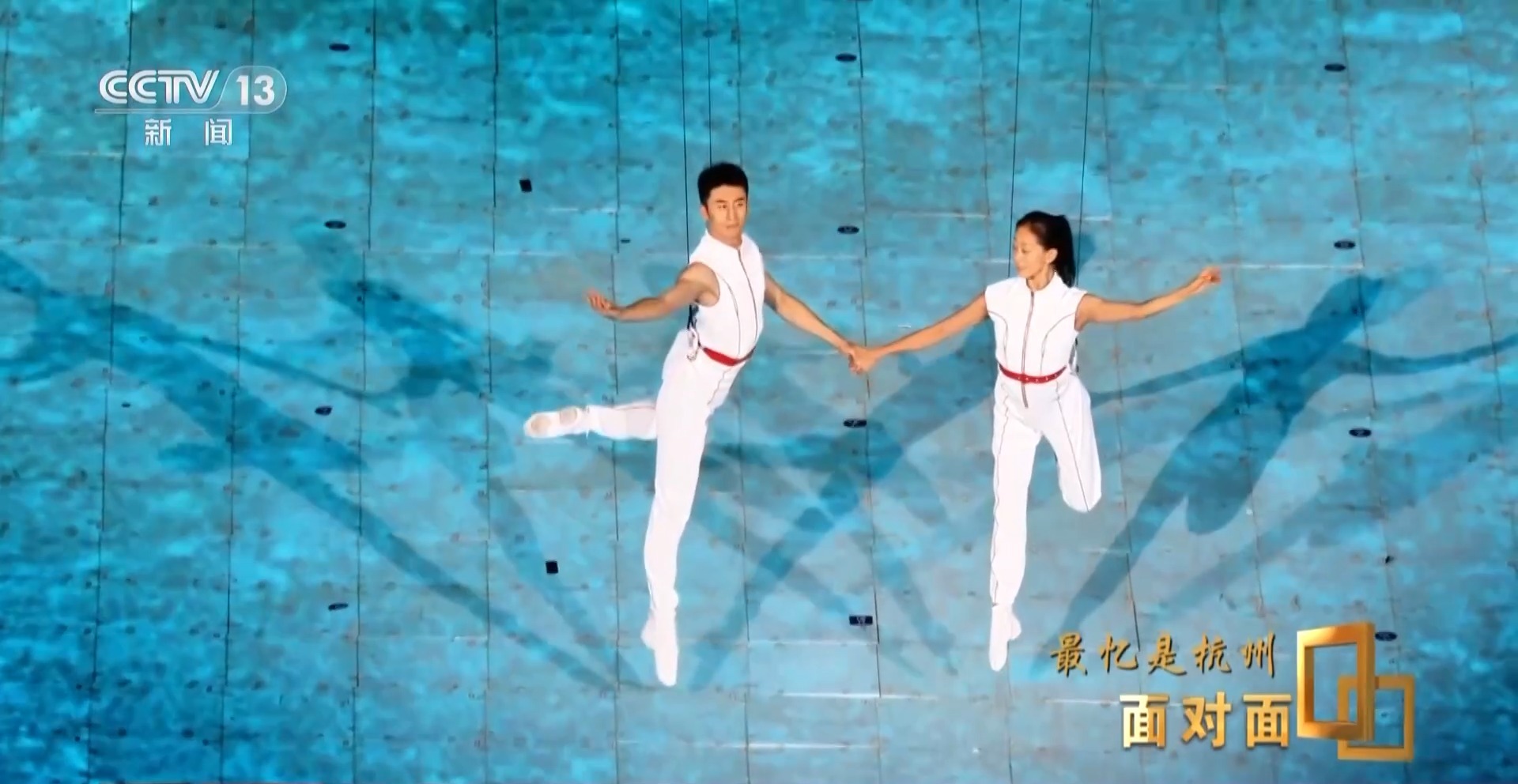 這是《錢塘潮涌》篇章中的雙人3D威亞節(jié)目,展現(xiàn)了勇立潮頭的波瀾壯闊場景,這也是世界上首次在大型運(yùn)動場空間中使用雙3D威亞技術(shù)。