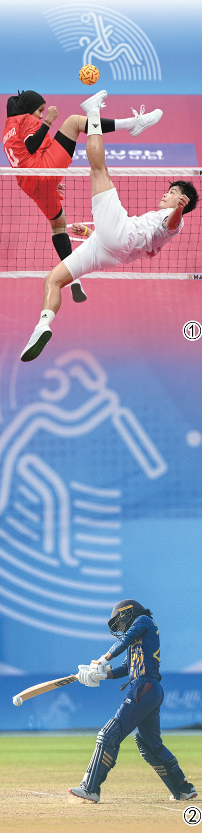 圖①:9月24日,藤球女子單組團(tuán)體預(yù)選賽,泰國(guó)體育代表團(tuán)選手曼立卡·汶托(前)對(duì)陣印度尼西亞體育代表團(tuán)選手。