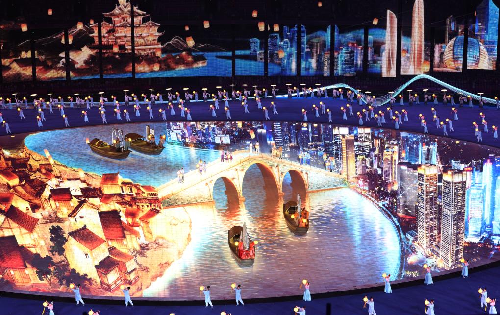 良渚遺址、錢江涌潮、西湖山水、運河古橋;巨幅網(wǎng)幕中,展開精心雕琢的“花中四君子”屏風;“團扇”地屏上,浮現(xiàn)出梅蘭竹菊、松荷柳桂,葉葉扁舟承載著琴棋書畫、詩詞酒茶……杭州第19屆亞運會開幕式呈現(xiàn)的泱泱中華國風雅韻、江南水鄉(xiāng)詩情畫意,歷歷在目,余音繞梁,令觀眾心潮激蕩,久久難以忘懷。