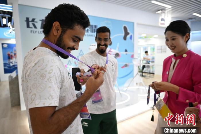 9月21日,浙江杭州,沙特運(yùn)動(dòng)員與運(yùn)動(dòng)員村內(nèi)工作人員交換徽章?!≈行律缬浾?趙文宇 攝