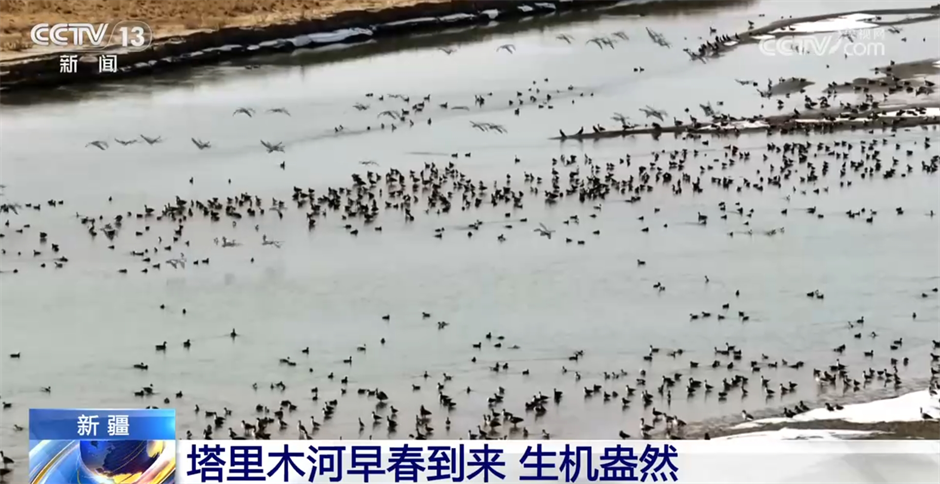 隨著天氣逐漸轉(zhuǎn)暖,現(xiàn)在在新疆塔里木河,近十萬只綠頭鴨、針尾鴨、赤麻鴨、紅頭潛鴨等水鳥暢游在流域大大小小的濕地,從空中俯瞰,冰雪初融的河面上,成群結(jié)隊(duì)的候鳥悠然嬉戲,展現(xiàn)出盎然生機(jī)。