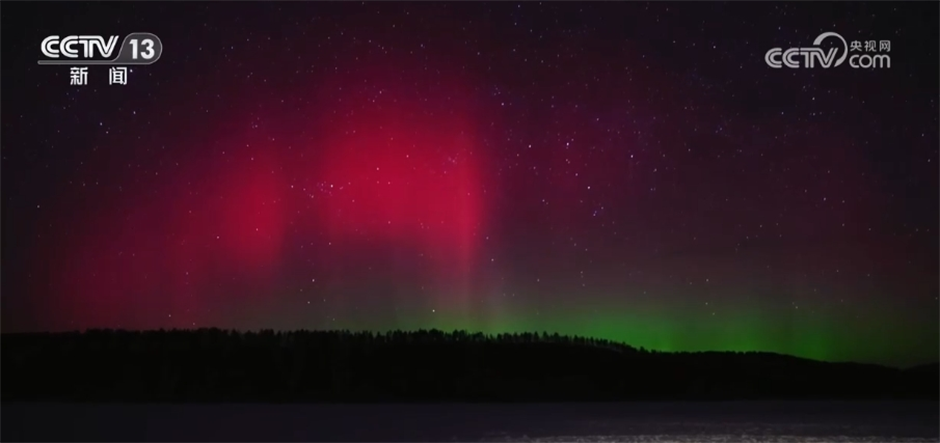 紫紅色和黃綠色的極光變幻著色彩,夜空中的繁星、地上的燈光和舞動的極光交相輝映,一時(shí)間光影在天地之間翻涌,如夢似幻。