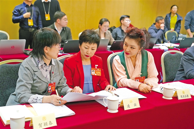3月5日,全國政協(xié)十四屆二次會議分界別討論政協(xié)常委會工作報告和提案工作情況報告,住藏全國政協(xié)委員緊緊圍繞兩個報告,結(jié)合西藏政協(xié)工作實(shí)際,在小組討論中積極履職建言。圖為住藏全國政協(xié)委員朗杰拉措(右)在會議開始前與參會的其他委員討論交流。記者 張思雨 旦增旺姆 攝