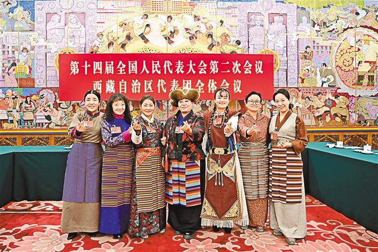 圖為西藏全國(guó)人大代表中的“七朵金花”在北京人民大會(huì)堂西藏廳合影留念,并祝福全區(qū)婦女同胞“三八”國(guó)際勞動(dòng)?jì)D女節(jié)快樂(lè)。
