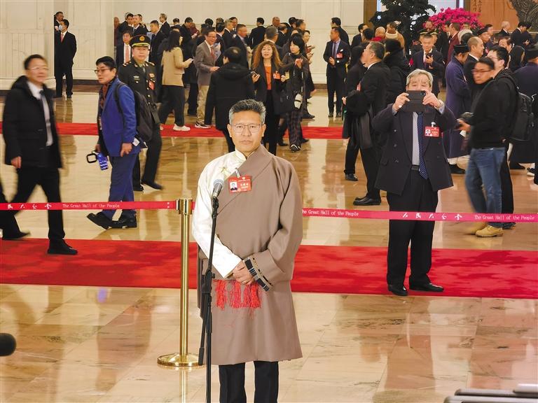 圖為3月7日上午,全國(guó)政協(xié)十四屆二次會(huì)議第二場(chǎng)“委員通道”集體采訪(fǎng)活動(dòng)開(kāi)啟。圖為住藏全國(guó)政協(xié)委員達(dá)瓦頓珠亮相“委員通道”并回答記者提問(wèn)。
