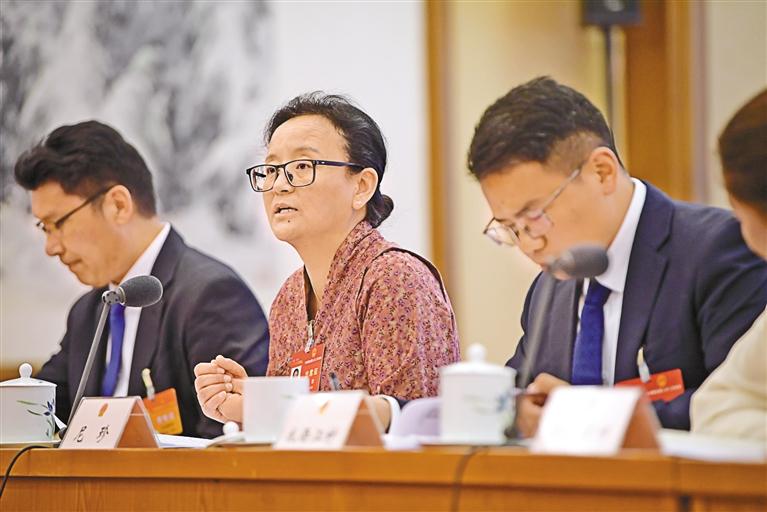 圖為3月7日,西藏代表團(tuán)舉行全體會(huì)議,傳達(dá)學(xué)習(xí)習(xí)近平總書(shū)記在看望參加全國(guó)政協(xié)十四屆二次會(huì)議的民革、科技界、環(huán)境資源界委員并參加聯(lián)組會(huì)議時(shí)的重要講話(huà),審議國(guó)務(wù)院組織法修訂草案,繼續(xù)審查計(jì)劃報(bào)告和草案、預(yù)算報(bào)告和草案。圖為尼珍代表在會(huì)上進(jìn)行討論發(fā)言。記者 旦增西旦 攝