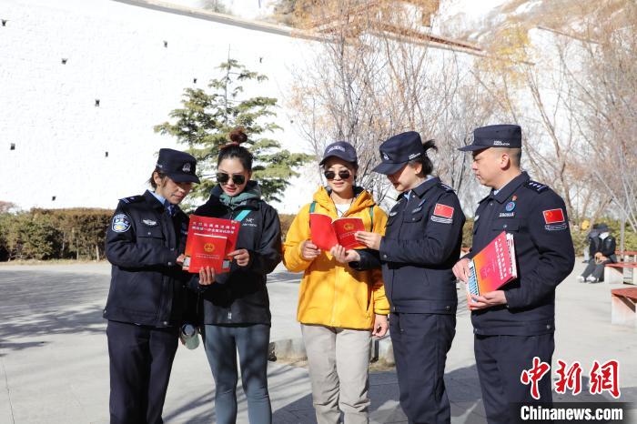 圖為西藏邊檢總站執(zhí)法調(diào)查支隊法制民警向游客普及憲法知識。徐錫萬 攝