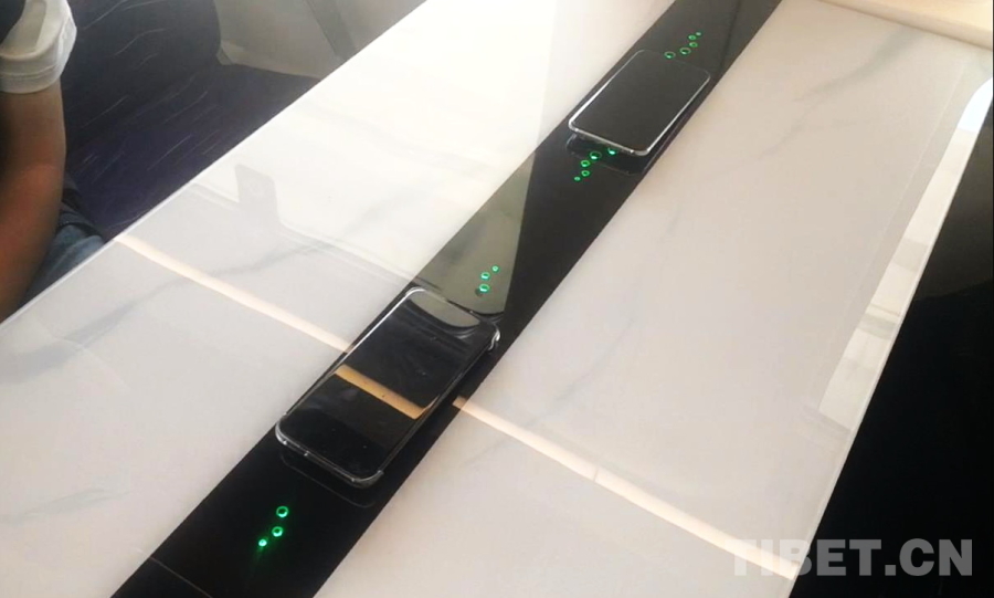 圖為乘客在三樂旅游鐵路列車上體驗(yàn)手機(jī)無線充電 攝影:劉莉