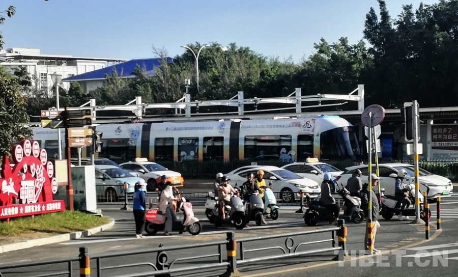 圖為涂裝第十二屆全國少數(shù)民族傳統(tǒng)體育運(yùn)動(dòng)會(huì)標(biāo)識(shí)的有軌電車駛過海南三亞街頭 攝影:劉莉