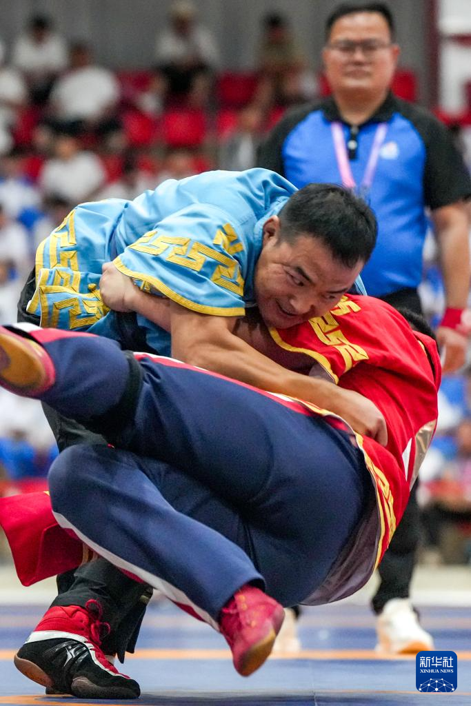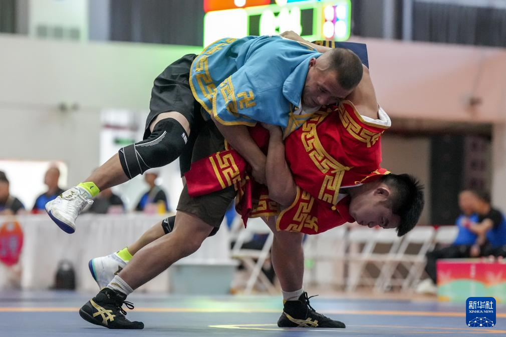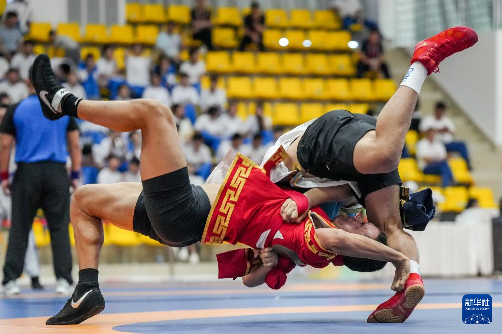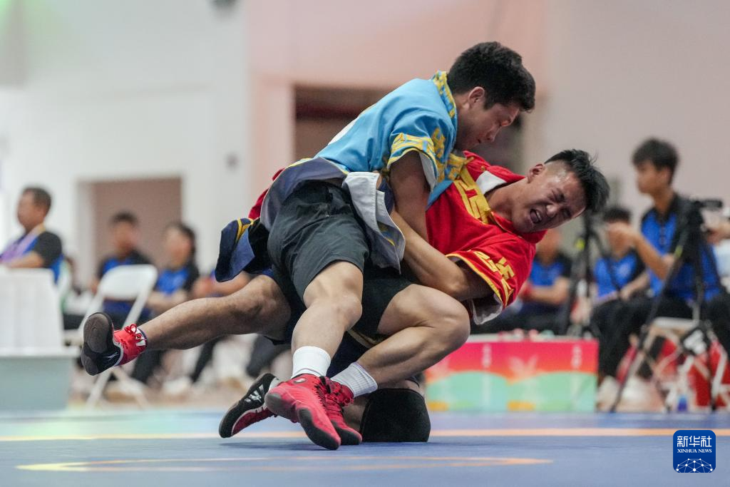 當日,第十二屆全國少數(shù)民族傳統(tǒng)體育運動會民族式摔跤北嘎淘汰賽第一輪比賽在海南省三亞市舉行。