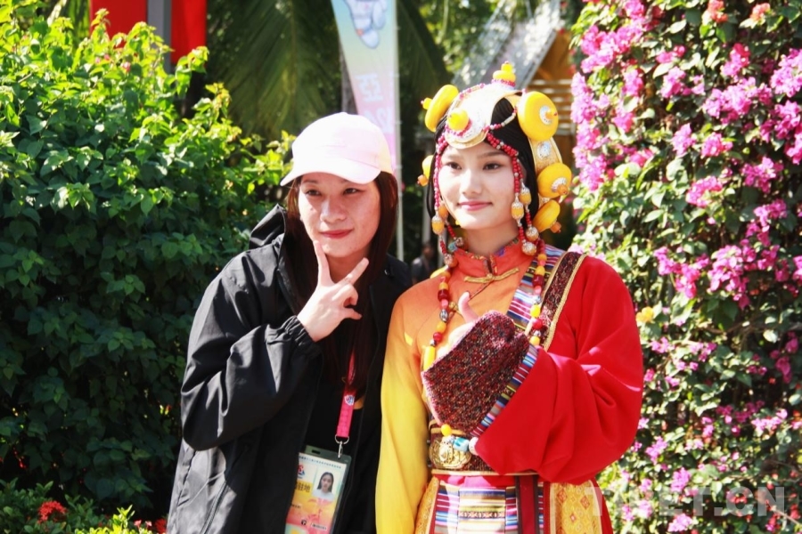 圖為第十二屆全國少數(shù)民族傳統(tǒng)體育運(yùn)動(dòng)會(huì)民族大聯(lián)歡活動(dòng)現(xiàn)場(chǎng),來賓與身著藏族服飾的演員合影 攝影:劉莉
