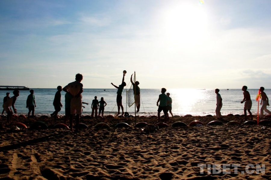 圖為第十二屆全國少數(shù)民族傳統(tǒng)體育運(yùn)動(dòng)會(huì)民族大聯(lián)歡活動(dòng)現(xiàn)場(chǎng),各代表團(tuán)運(yùn)動(dòng)員們感受沙灘排球 攝影:劉莉