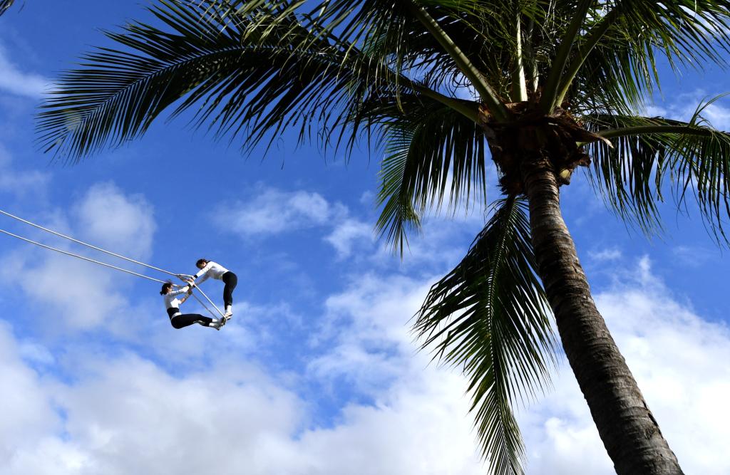 11月24日,上海隊組合劉雨諾/張涵瑾(左)在比賽中。當(dāng)日,第十二屆全國少數(shù)民族傳統(tǒng)體育運動會秋千55公斤以上雙人高度決賽在海南三亞舉行。新華社記者 王曉 攝