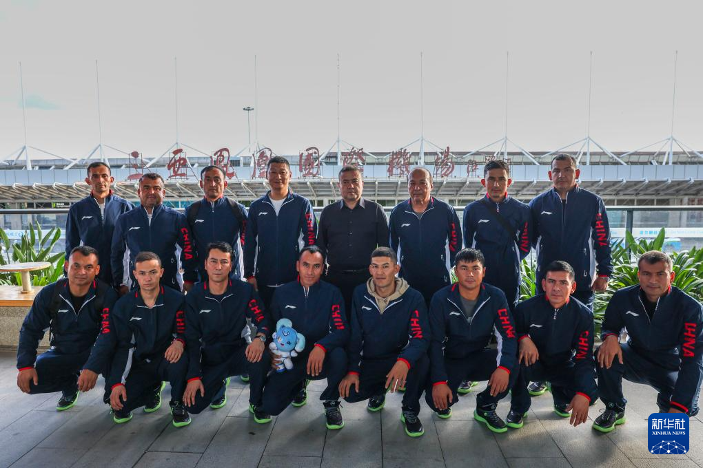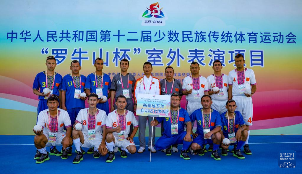 這是11月24日,在三亞市體育中心,新疆麥熱球隊成員在第十二屆全國少數(shù)民族傳統(tǒng)體育運動會室外表演項目開始前合影。