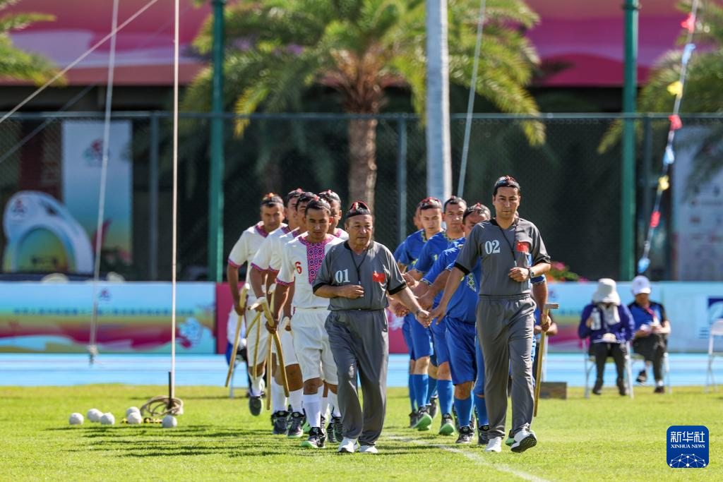 這是11月24日,在三亞市體育中心舉行的第十二屆全國少數(shù)民族傳統(tǒng)體育運動會室外表演項目中,新疆麥熱球隊隊員入場。