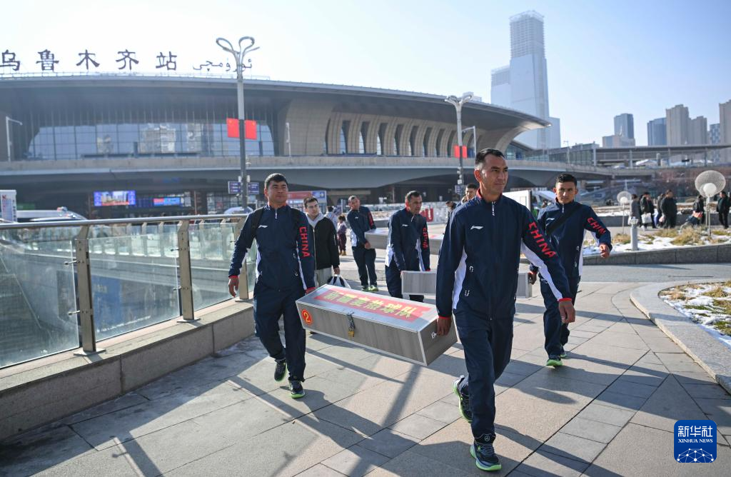 這是11月17日,阿卜杜拉艾孜則·阿卜杜海娃爾(前右)和隊友攜帶比賽裝備從于田抵達烏魯木齊站。