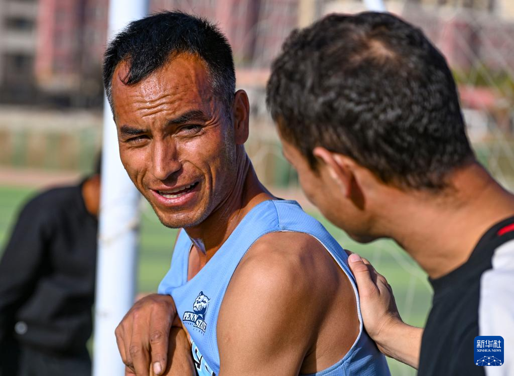 這是11月8日,在新疆于田縣體育場,阿卜杜拉艾孜則·阿卜杜海娃爾(左)在訓練后和隊友交流。