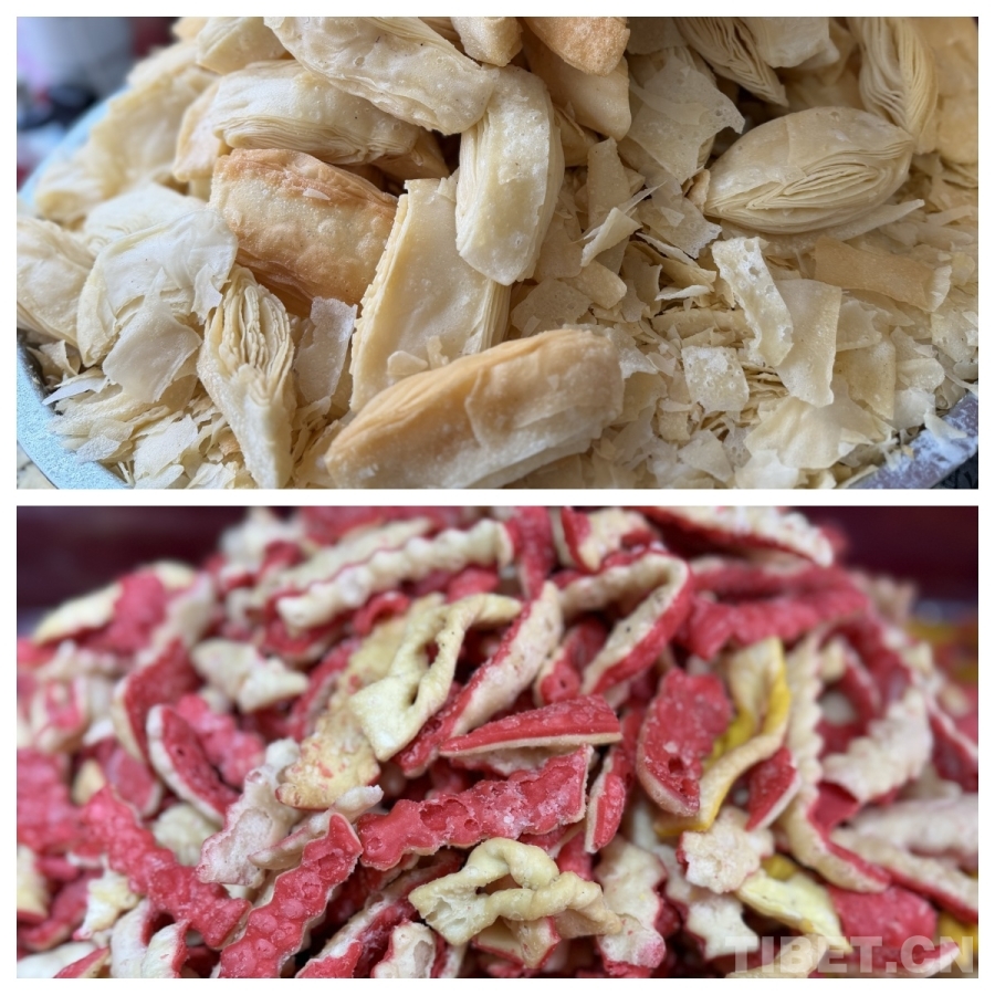 圖為卡塞,是一種油炸面食,是藏歷新年必備的年貨之一。卡塞一般用面粉、酥油、白糖等原料,油炸而成。橢圓形的“果子”、蝴蝶狀的“耳朵”……各色造型的“卡塞”寄托著人們對團圓、富足的美好祈愿。