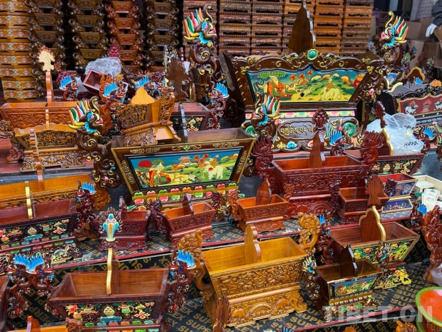 圖為切瑪盒,是藏歷新年的“儀式感核心”?!扒鞋敽小笔菍⒕贫沸文竞杏酶舭宸珠_,左右兩邊分別盛入炒青稞和糌粑,再插上象征五谷豐登的“羅薩梅朵”和寓意吉祥的酥油花,寓意人壽年豐、吉祥如意。